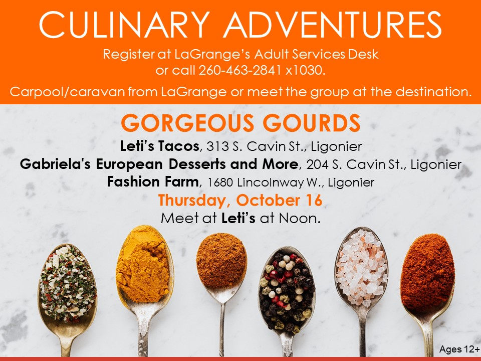 Register at the LaGrange Library or by calling 260-463-2841 x1030 so we’ll know how many to expect.