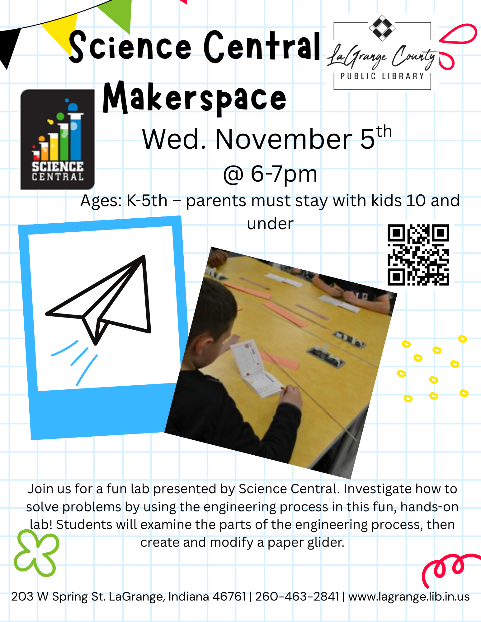 Join us for a fun lab presented by Science Central. Investigate how to solve problems by using the engineering process in this fun, hands-on lab! Students will examine the parts of the engineering process, then create and modify a paper glider.
