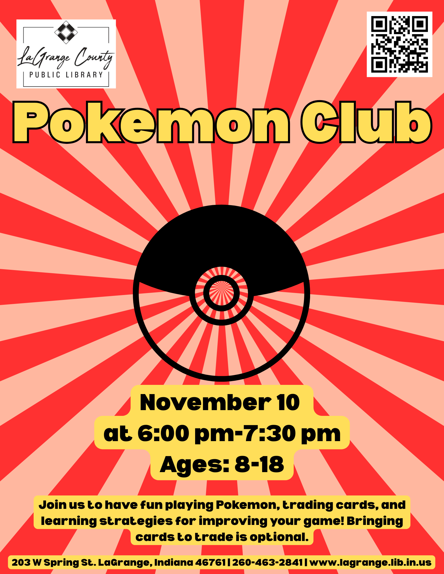Join us to have fun playing Pokemon, trading cards, and learning strategies for improving your game! Bringing cards to trade is optional.