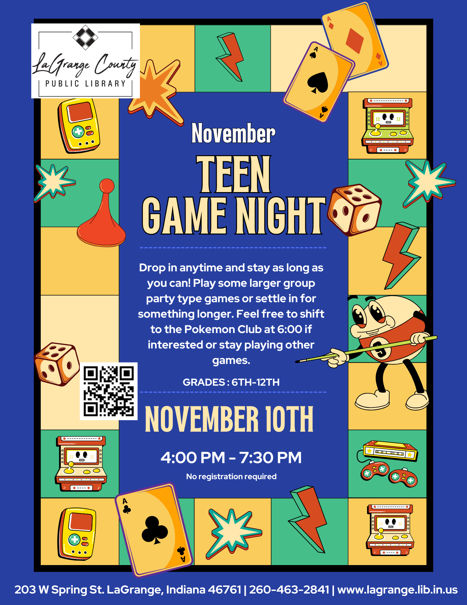 Drop in anytime and stay as long as you can! Play some larger group party type games or settle in for something longer. Feel free to shift to the Pokemon Club at 6:00 if interested or stay playing other games.